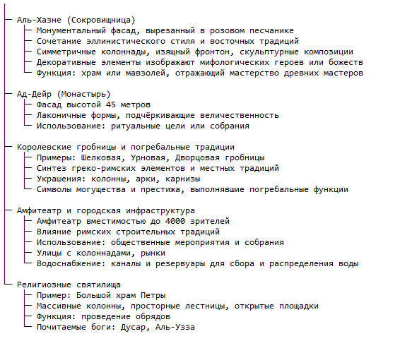 Петра объединяет в себе монументальные сооружения, инженерные достижения и гармонию с природным ландшафтом. Каждый объект отражает культурное наследие и богатство древнего города, который остаётся уникальным памятником мирового значения.